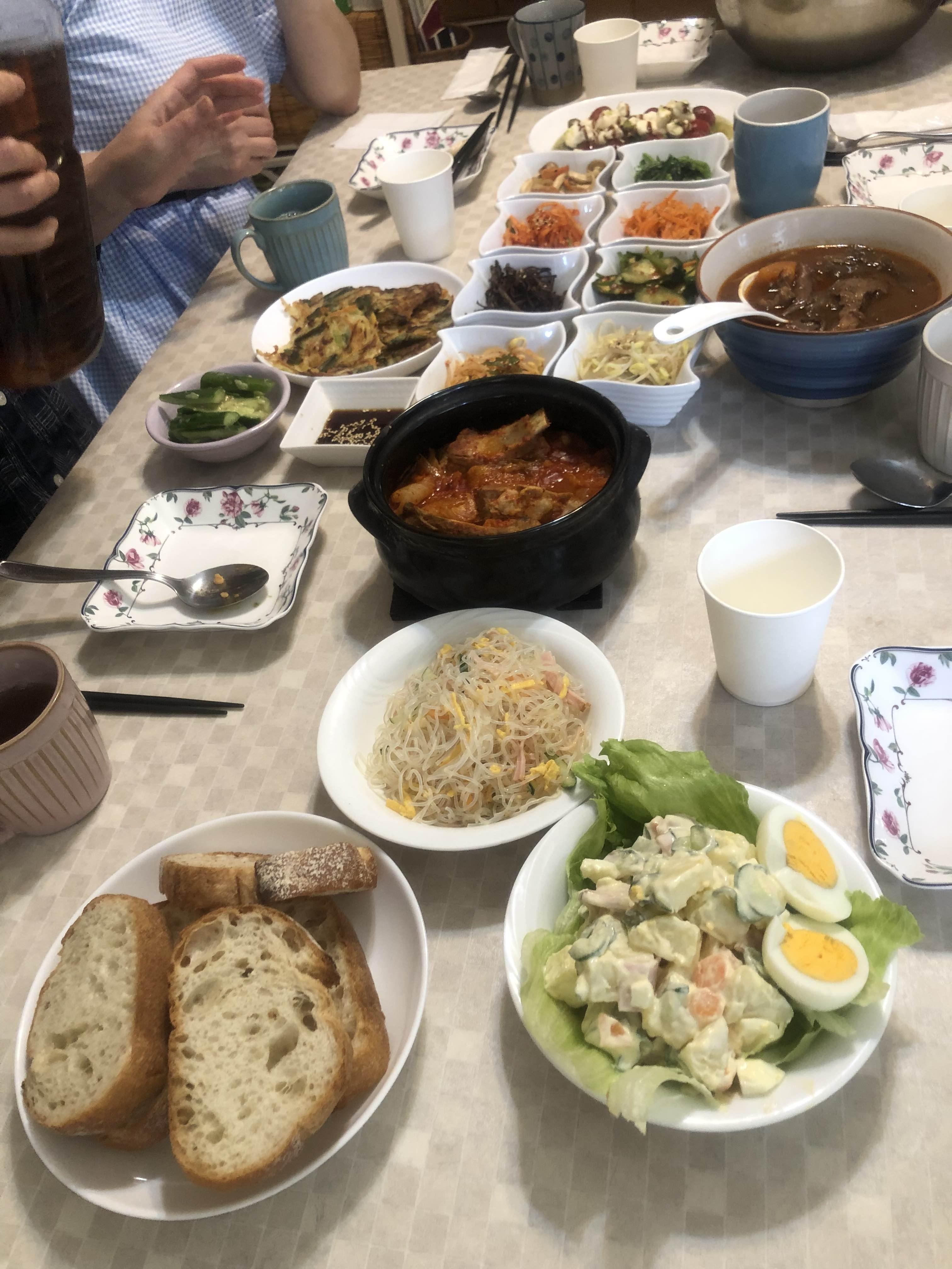 또 한 친구는 감자 샐러드와 하루사메 ( 녹두로 만든 잡채 비슷한 면) 샐러드와 디저트로 홍차 푸딩을 만들어 왔다