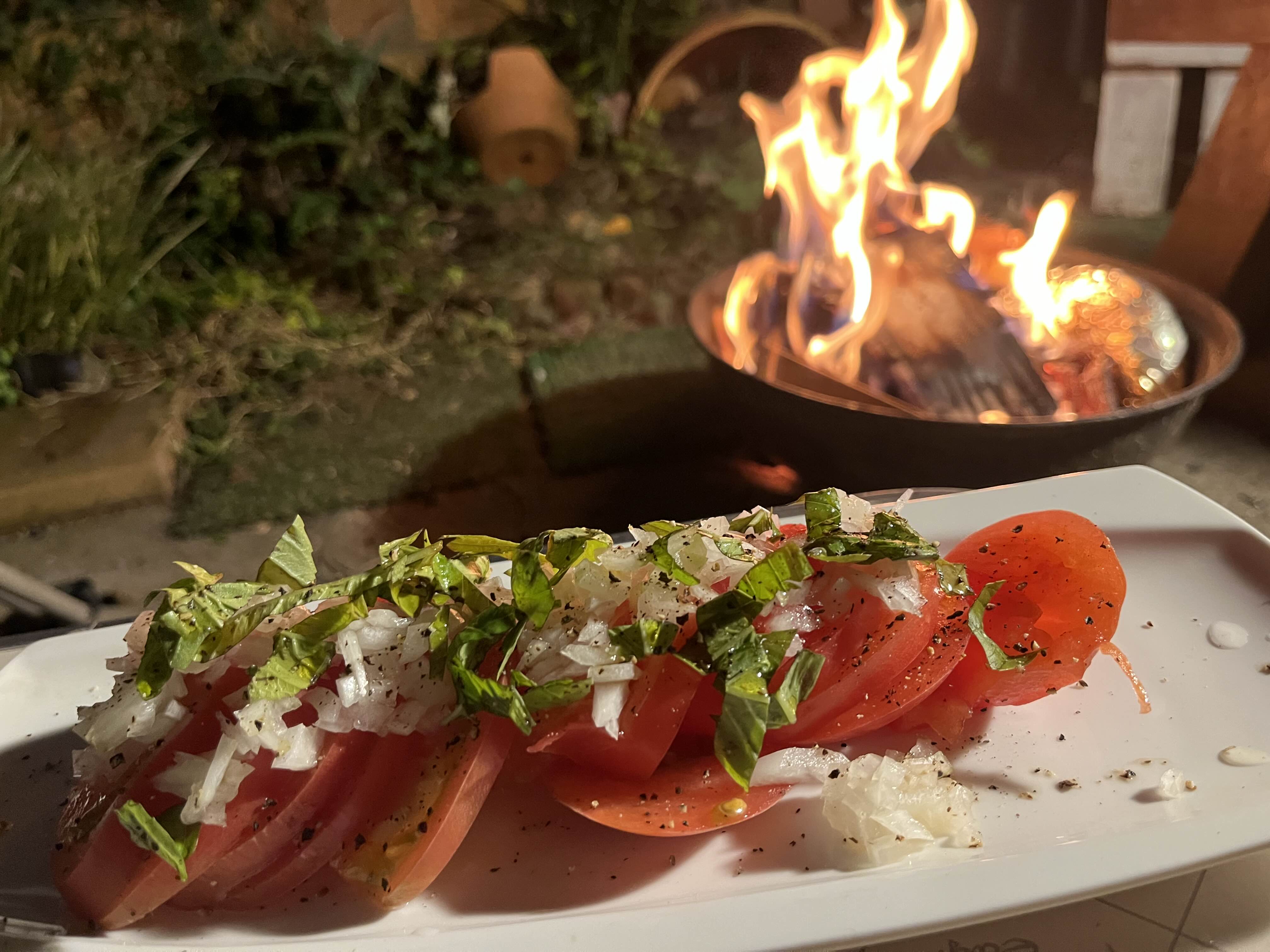 토마토에다가 양파 잘게 다져 올리고 마당에서 바질 따다가 썰어 올린후 올리브 오일 몇 바퀴 돌려주고 마지막 후추 갈아주면 끝 !