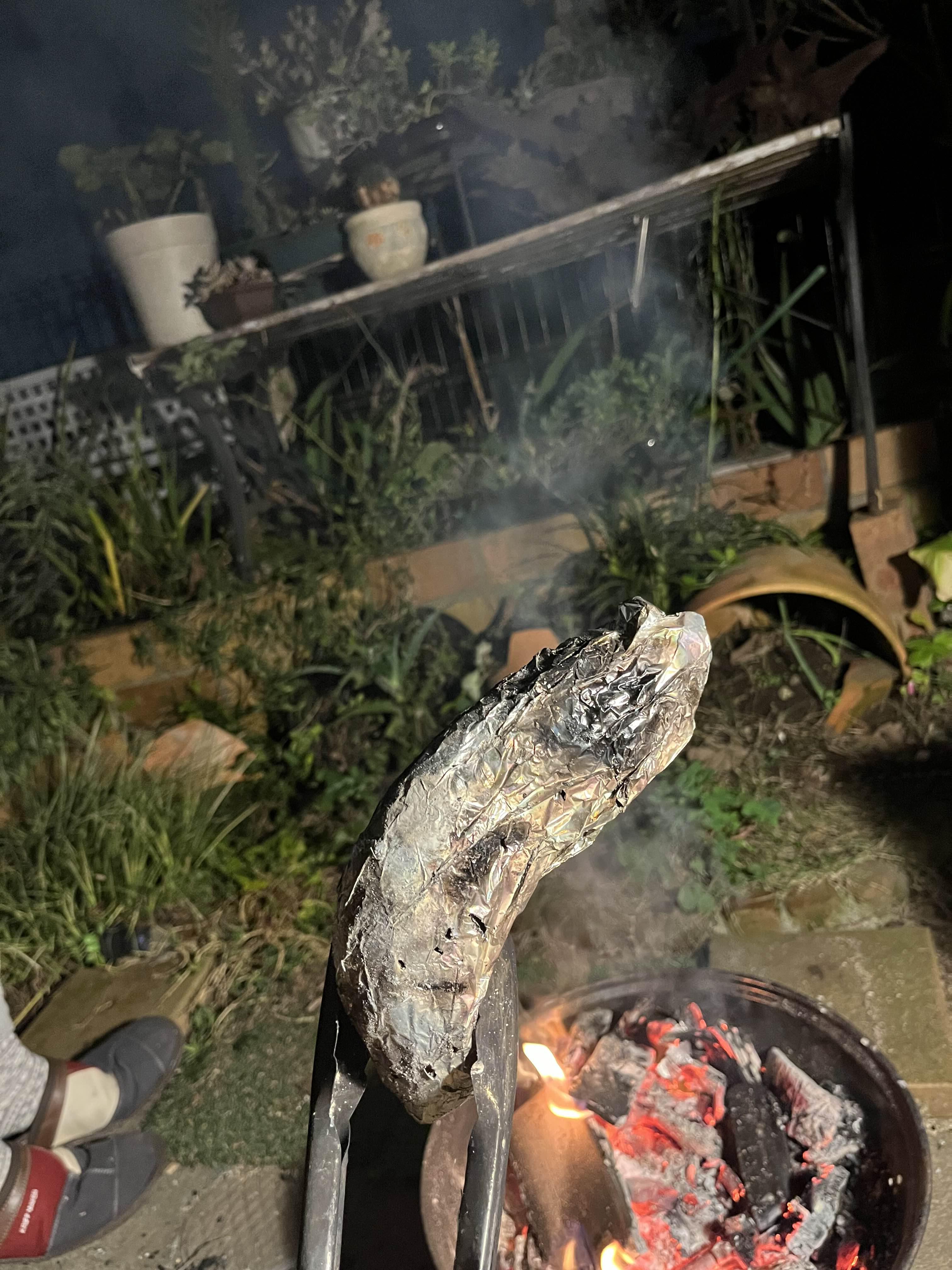 불을 피우고 제일 먼저 한 일은 고구마 하나 던져 넣기!