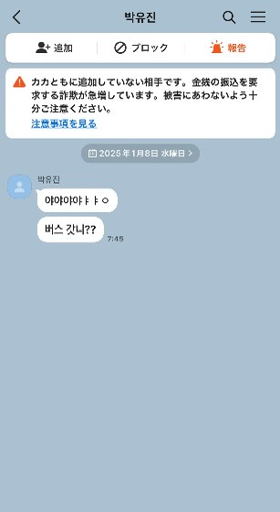 친구가 아닌 상대에게서 온 톡에 바로 경고 메세지가 뜨다니 …
