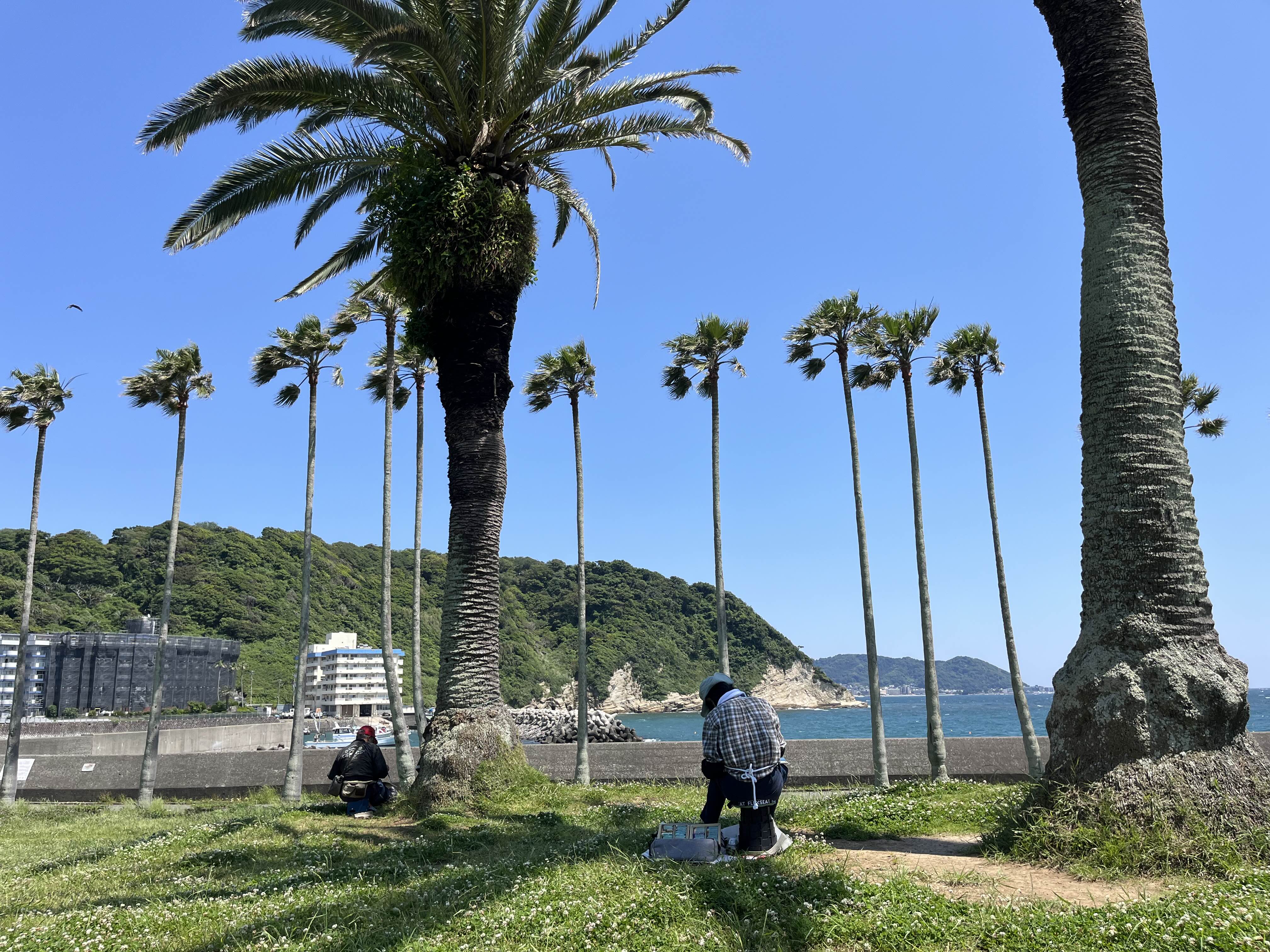 야자수 나무 그늘 아래에서 그림을 그리고 있는 할이버지들..