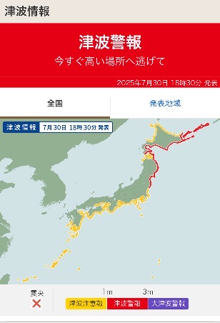 쓰나미 경보는 예상 높이 1미터 이상 3미터까지이다