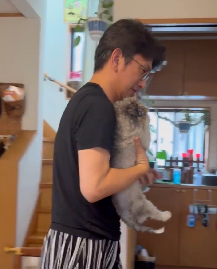 아빠의 수상한 움직임을 감지한 모꼬짱이 뼈다귀를 물고 도주를 했고 자기야가 모꼬짱을 체포한 장면이라고 한다