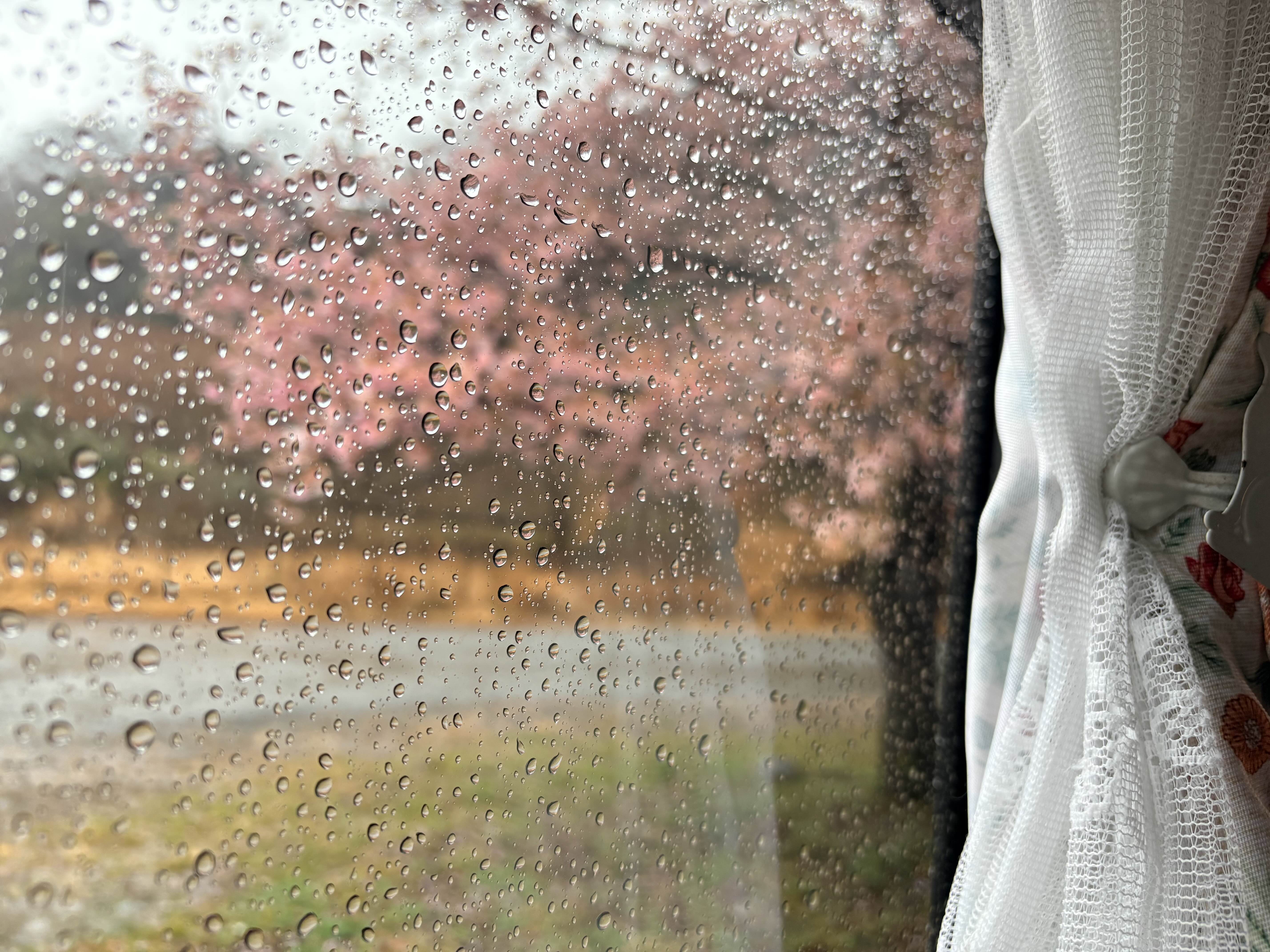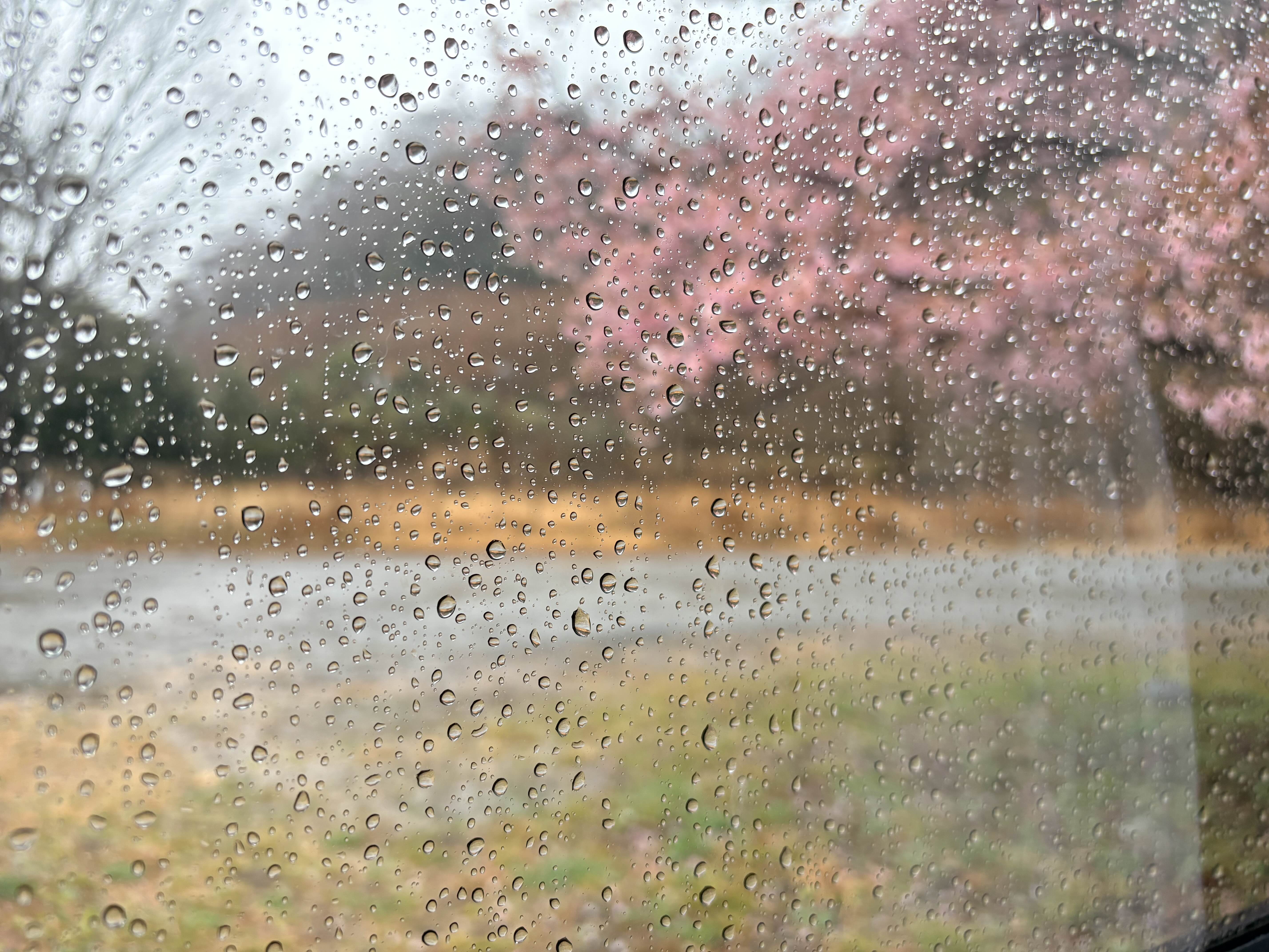 빗물에 잔뜩 젖어 고개를 숙인 가와츠 사꾸라도 나름 운치가 있다