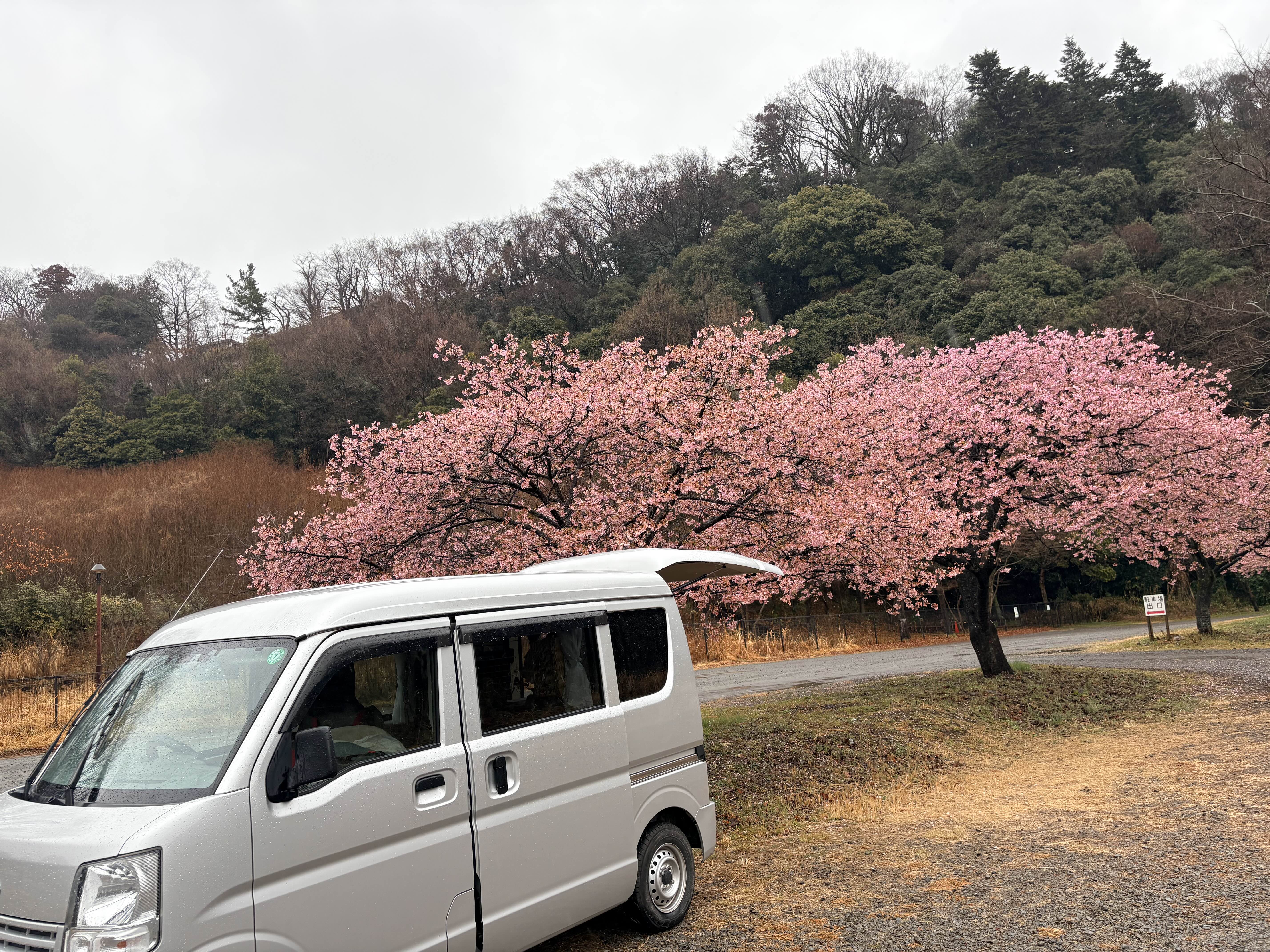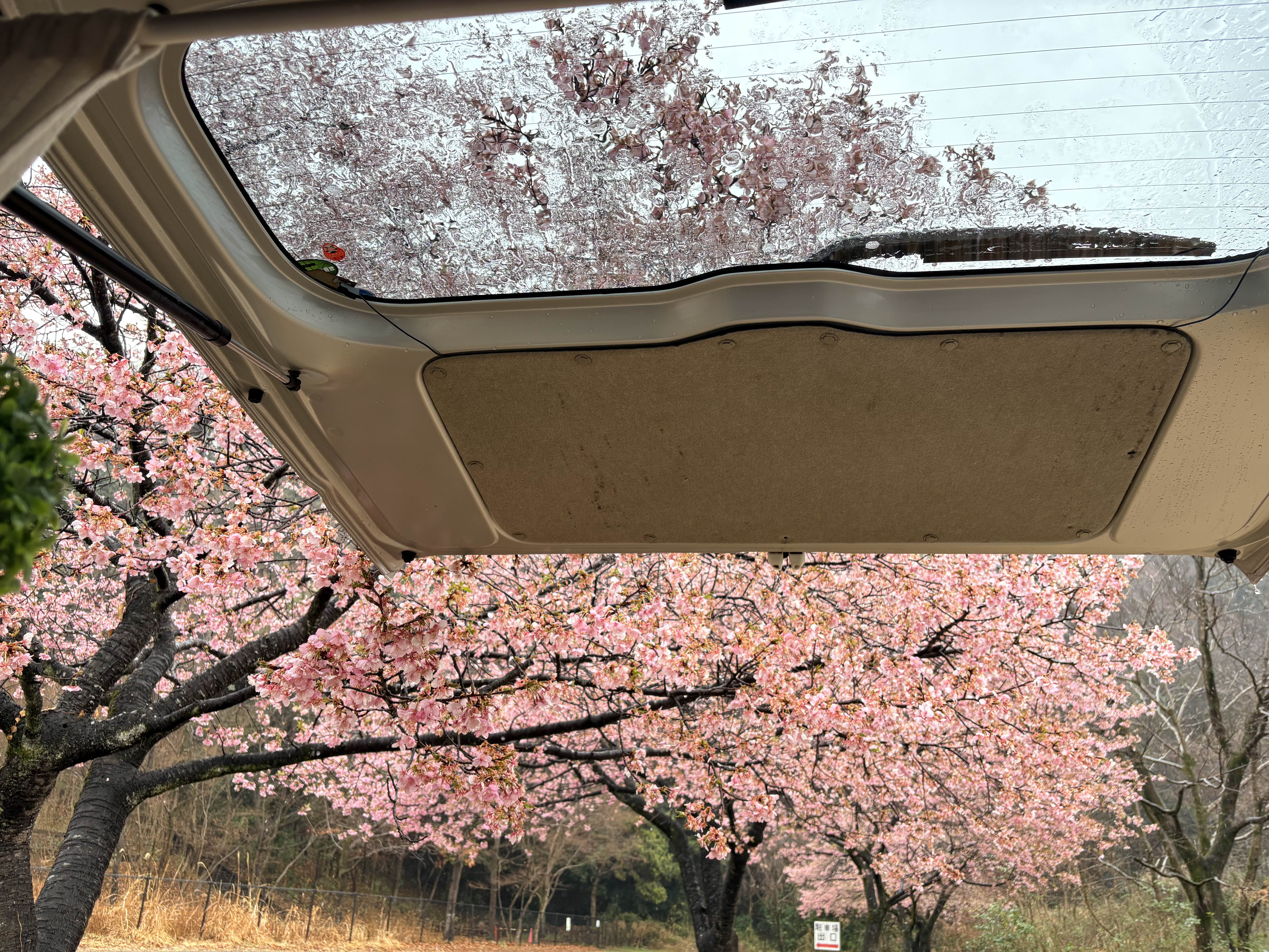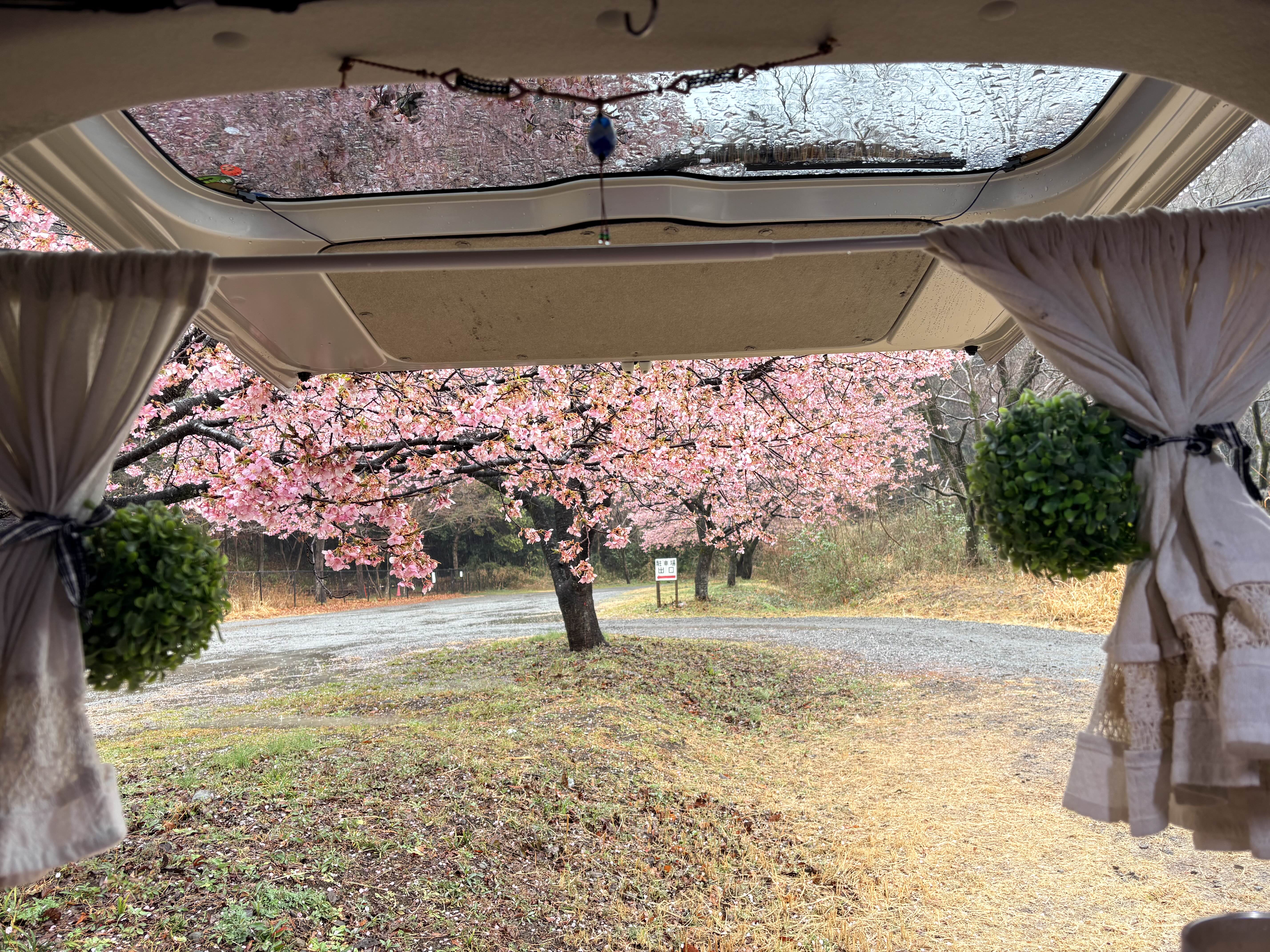 차 뒷문을 활짝 열어젖히고 꽃구경도 하고 빗소리도 들으며 차크닉 스타트
