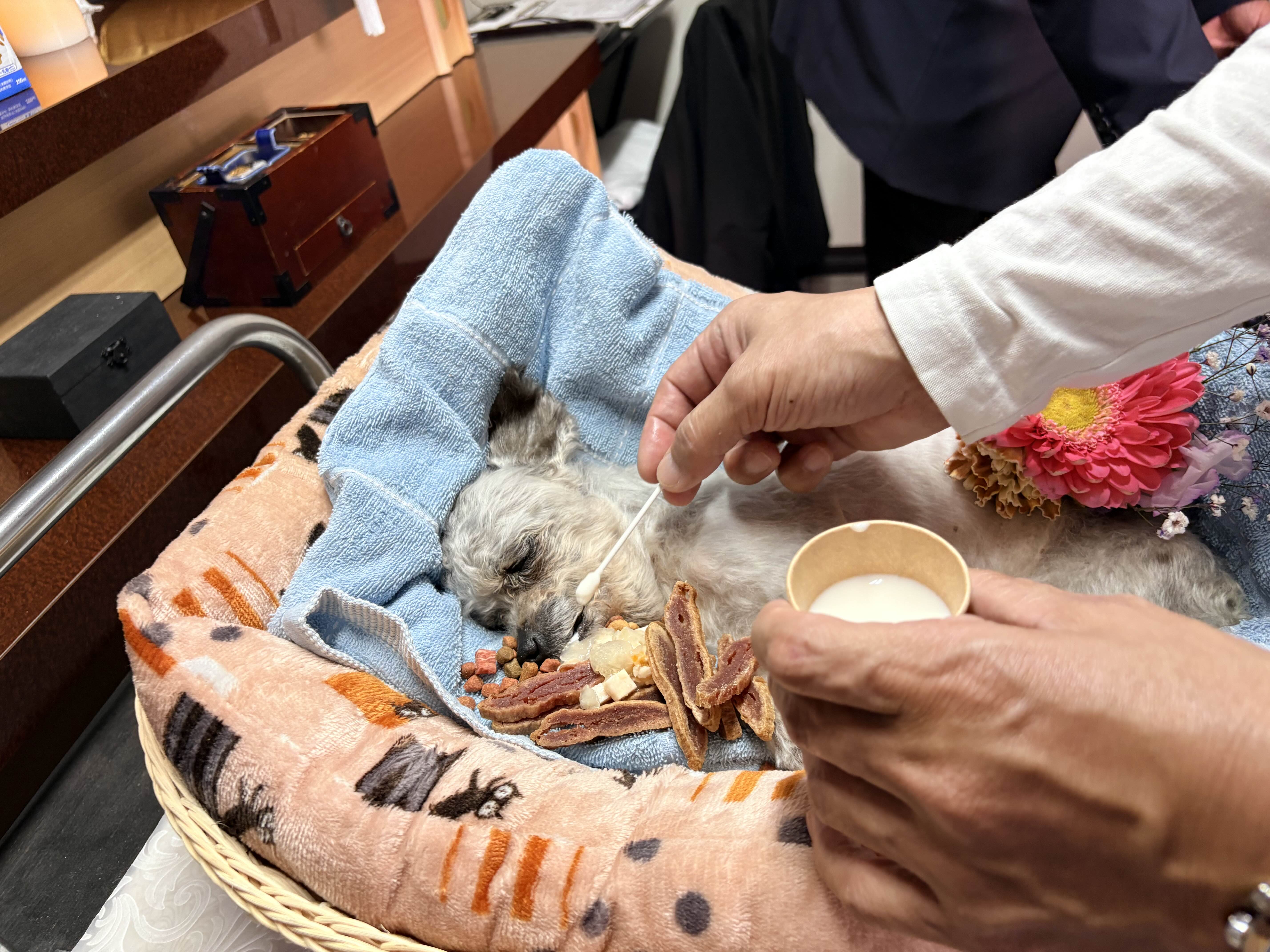 모꼬가 평소에 먹던 사료랑 간식 그리고 우유를 차려 놓고 모꼬를 보내는 의식을 치렀다